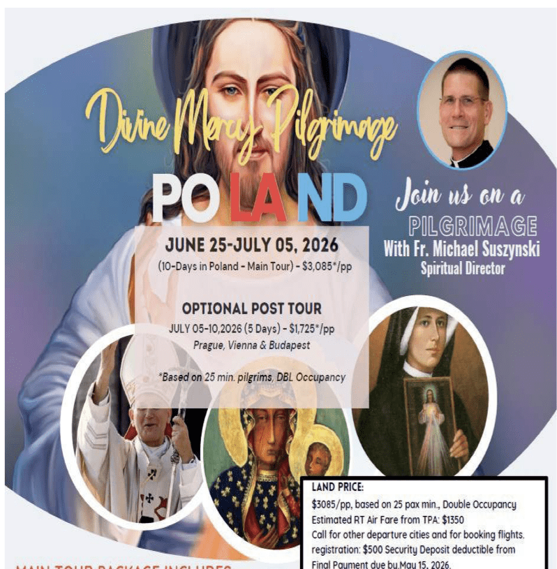 Join Fr. Michael Suszynski (Spiritual Director) on a Pilgrimage to Poland. This transforming journey includes Warsaw (St. Faustina’s entry to a convent), Krakow, Swince Warlike, Czeschotowa and many other places. While visiting at these places you will see the baptismal place of Saint Faustina, the Miraculous, Black Madonna, the birthplace and baptismal site of Saint John Paul II, a Nazi, concentration camp, and an underground Cathedral, Our Lady of Fatima shrine, and Divine Mercy shrine at Saint John Paul II.